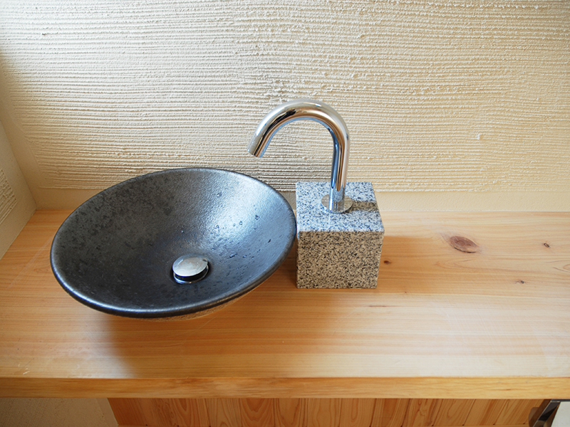 洗面器を置いた台は、吉野桧(節あり)の一枚板。自然素材の塗り壁との相性も抜群。
