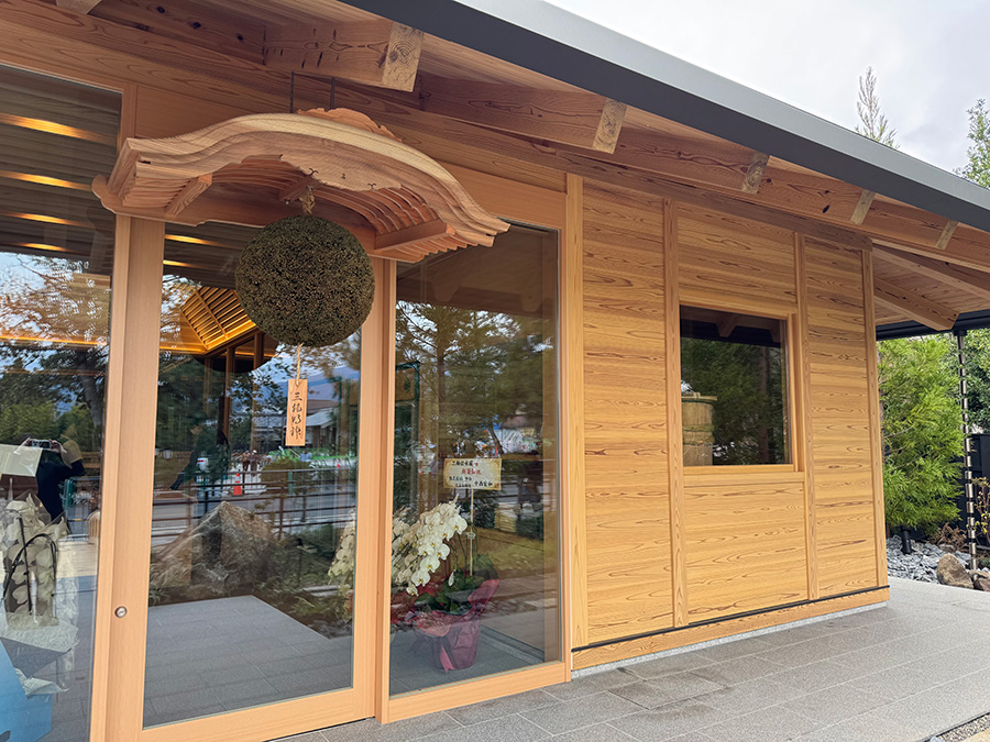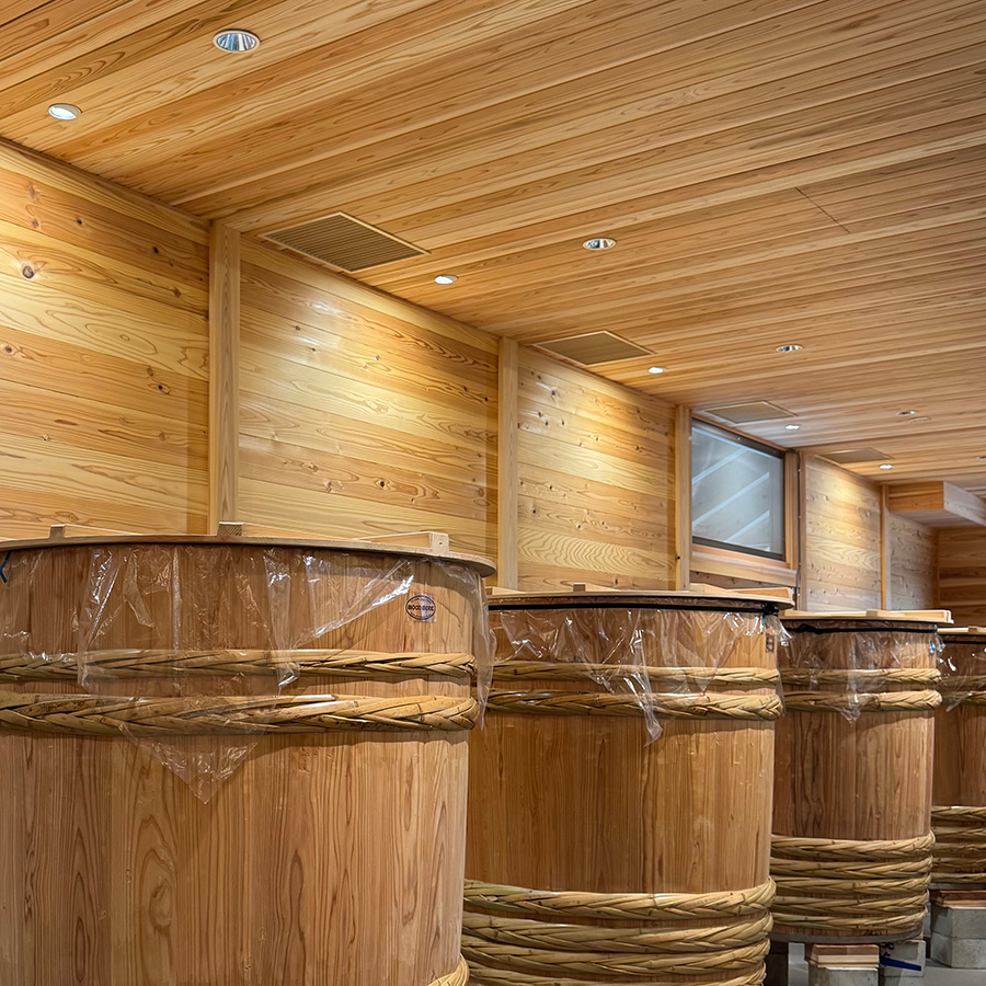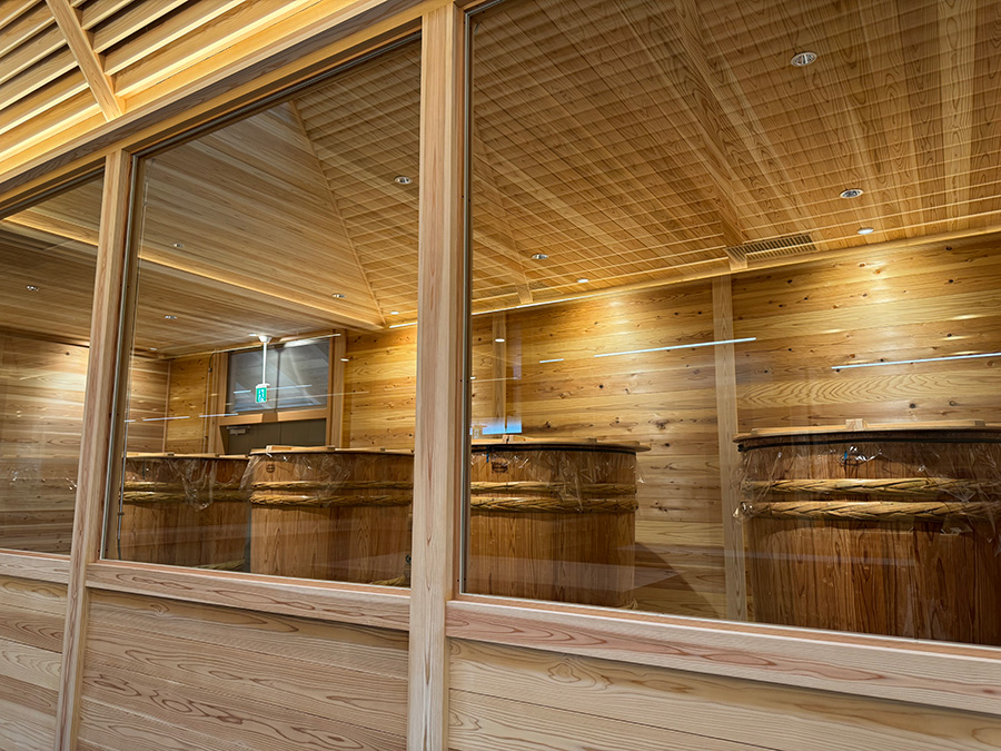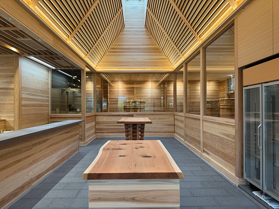 同社の代表的な銘柄「三諸杉」の名に相応しく、全てに吉野杉が使われた木造建築で、外装は板倉造り、内装は校倉造り、屋根の軒先には桔木構造を採用するなど、日本の伝統的な宮大工の技が結集した建物となっています。