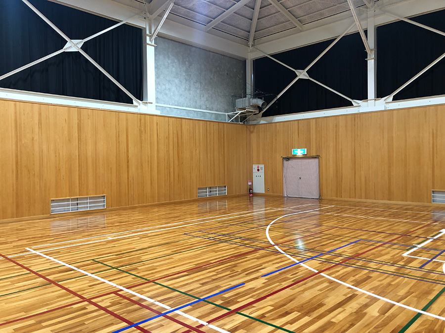 この体育館の壁材として、当社の吉野杉の羽目板を納めさせていただきました。
