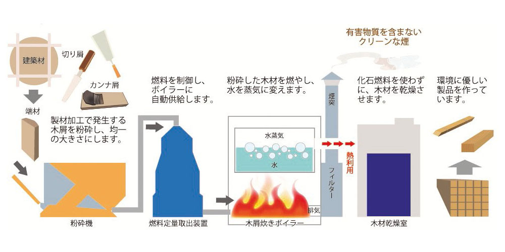 製造段階で出た端材や粉を燃やし、有害物質を含まないクリーンな煙にして排出します。