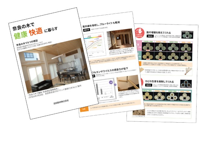 検証内容や効果がまとめられている「奈良の木で健康・快適検証事業報告」は、許可を得て当社でもパンフレット化しています。